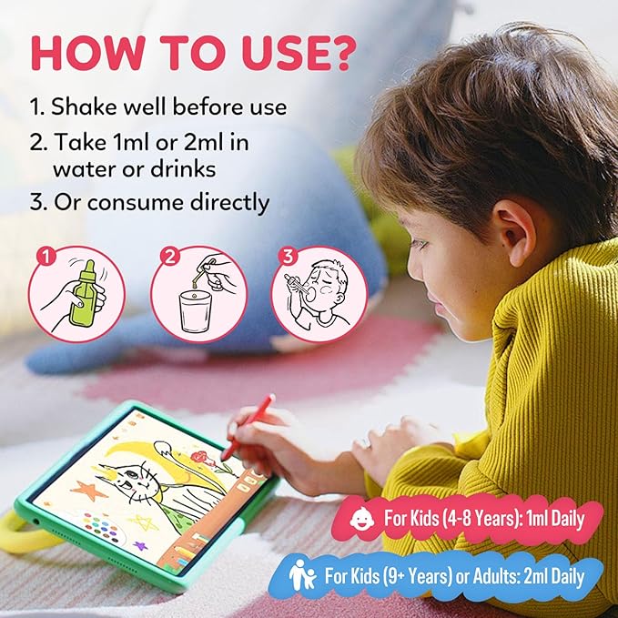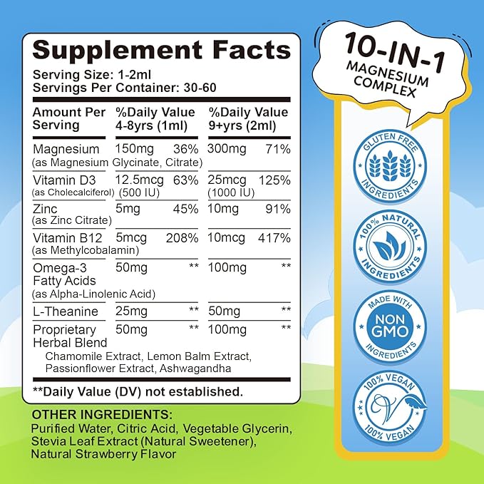 - FOCUS & COGNITIVE DEVELOPMENT: Magnesium glycinate liquid drops for kids combine Magnesium, Vitamin B12 and Omega-3 to support brain function, enhance focus, and promote cognitive function in growing children. Enhanced with L-Theanine and Vitamin D3, it helps regulate mood, improve mental clarity, and encourage emotional balance. An excellent choice for children who need extra support with concentration and calmness