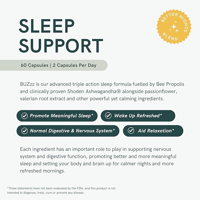 - BUZzz SLEEP: Our triple action sleep formula, fuelled by Bee Propolis and clinically proven Shoden Ashwagandha, together with passionflower, valerian root extract and other powerful yet calming ingredients.