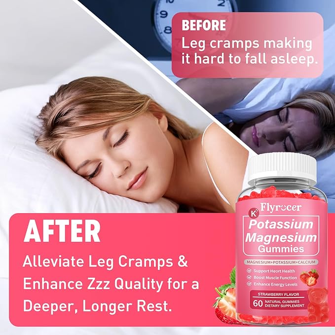 - Supports Muscle Health & Reduces Leg Cramps: The combination of potassium and magnesium helps relax muscles and reduce leg cramps. These gummies help alleviate muscle tension, supporting quick recovery after exercise and reducing discomfort for active individuals