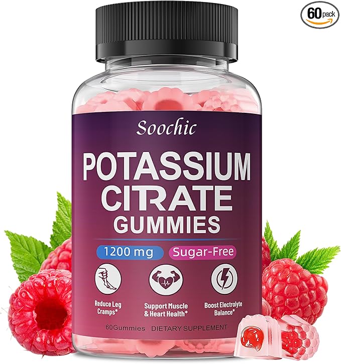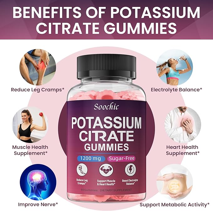 - 1200mg Potassium Citrate: Many adults struggle to get enough potassium from their diet. Simply take 2 gummies a day to easily meet your daily requirement of 1200 mg, providing a convenient boost and making it an ideal choice for adults who find it hard to get enough potassium