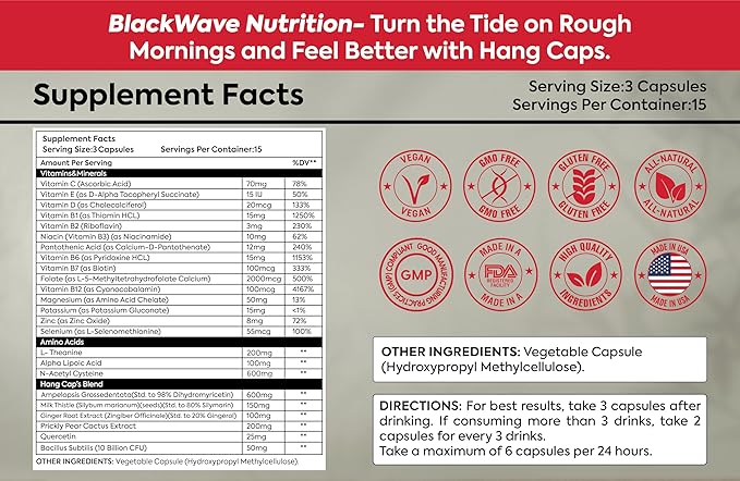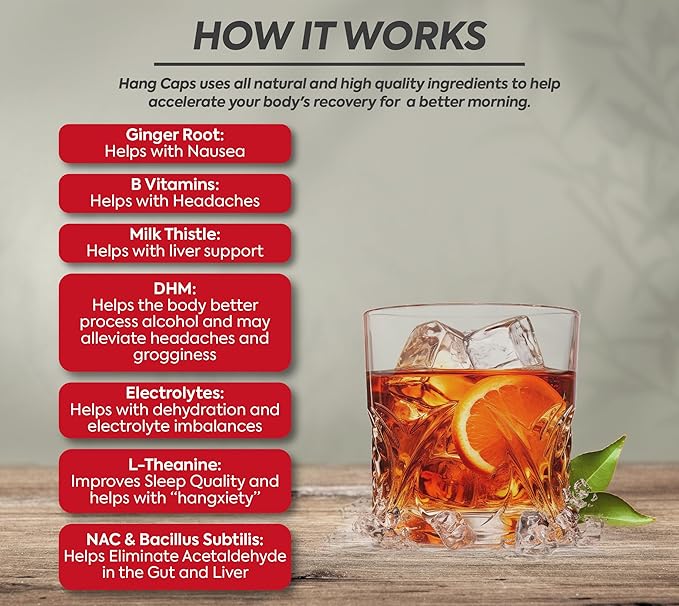 - Backed by Science, Built for Recovery: Packed with DHM, Ginger, B Vitamins, and electrolytes, Hang Caps fight nausea, headaches, rehydrate, and ease the "morning after" fog.