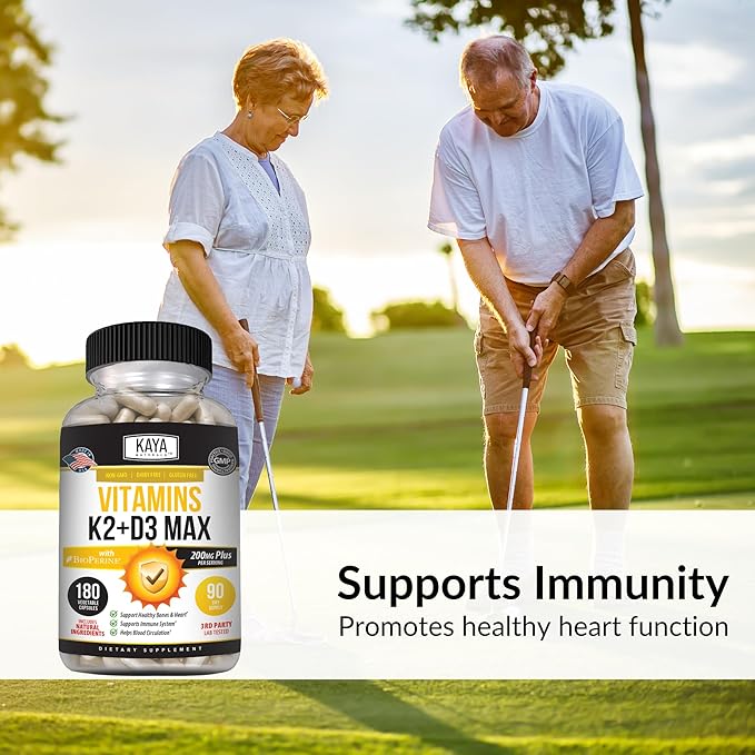 Kaya Naturals Vitamins K2 with D3 5000IU Supplement for Men and Women - Easy to Swallow - Bioperine Capsules (180 Count (Pack of 1)