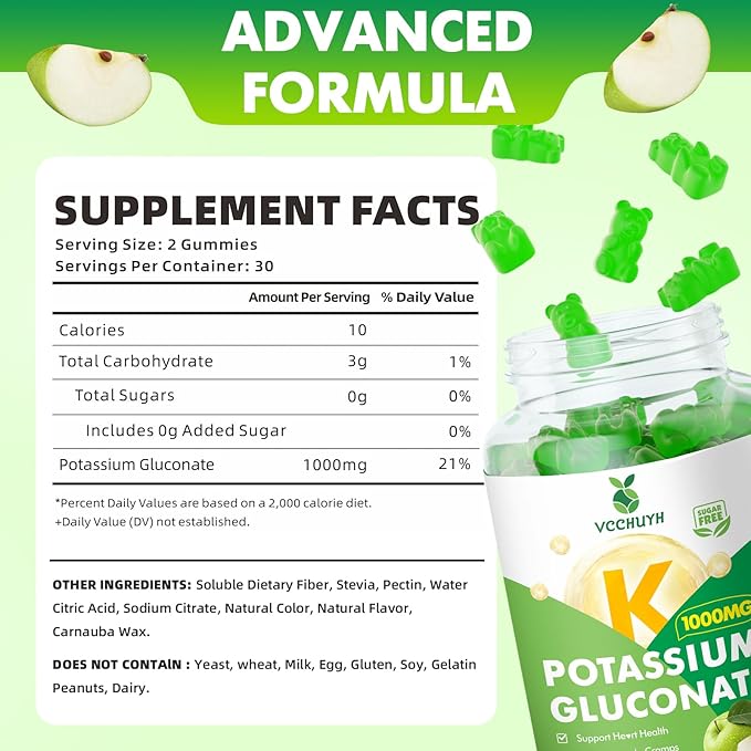 - 1000mg High-Potency Potassium Gummies: Deliver optimal daily support with 1000mg potassium gluconate per serving (2 gummies), specially formulated to address muscle cramps, fatigue and electrolyte imbalance