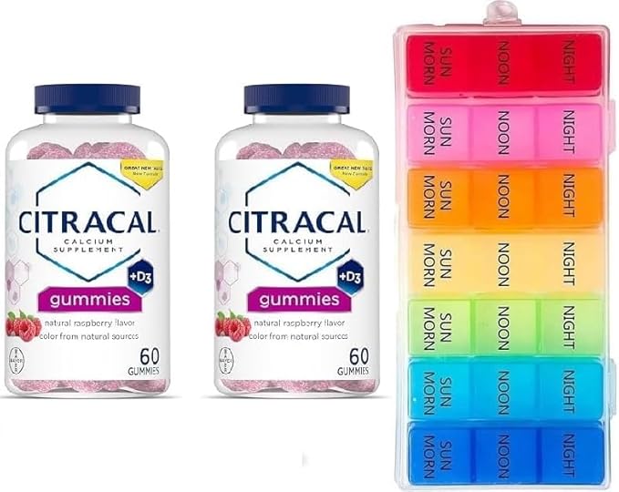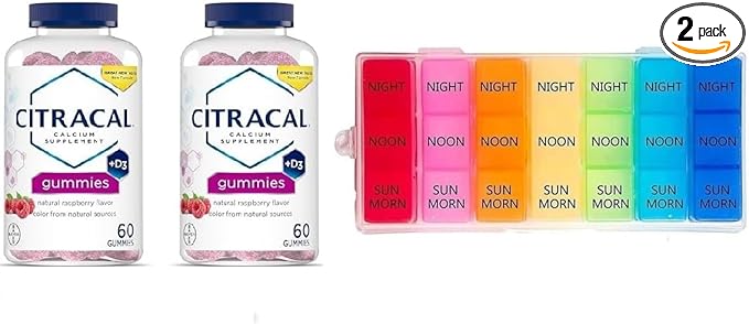 - BUNDLE Plus Day Pill Organizer with Calcium +D3 Gummies Assorted Flavors 60 Ct., Pack of 2, Citracal Calcium Supplement Gummies, Chewable Calcium with Vitamin D3, Supports Bone Health, Calcium Chews for Ages 12+, Natural Raspberry Flavor, 60 Count