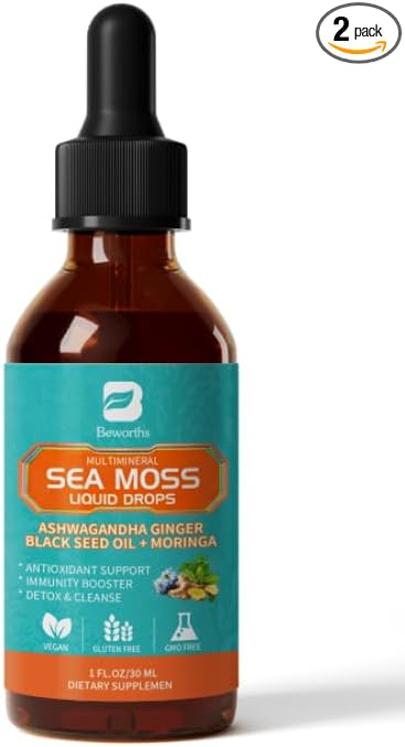 Sea Moss Drops with Black Seed Oil Ashwagandha Turmeric Bladderwrack Burdock & Vitamin C Vitamin D3 with Elderberry Manuka, Chlorophyll