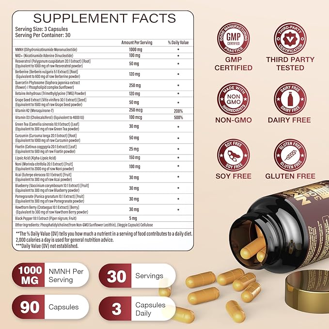 19 in 1 NMNH (Dihydronicotinamide Mononucleotide) 1000mg Per Serving, NAD Supplement to Boost NAD+ Levels NAD Resveratrol Supplement with Quercetin, Berberine for Anti Aging, Energy, 90 Capsules-016