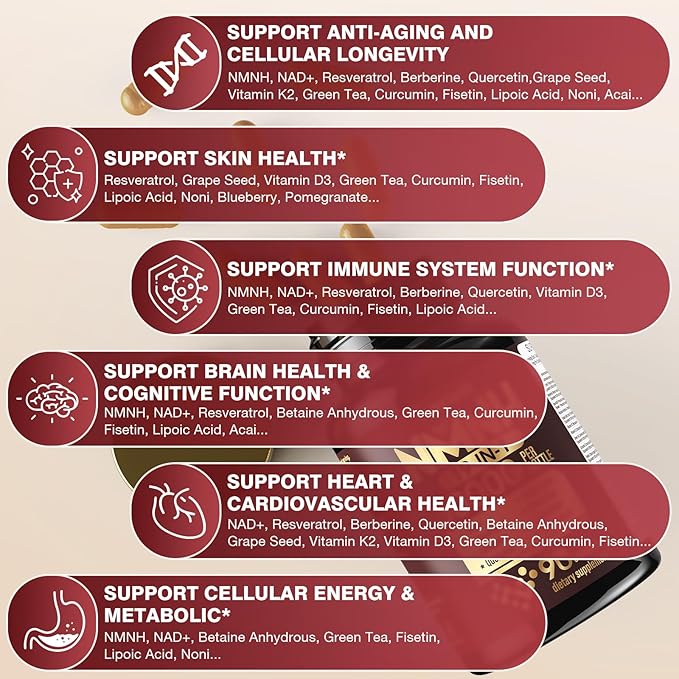 19 in 1 NMNH (Dihydronicotinamide Mononucleotide) 1000mg Per Serving, NAD Supplement to Boost NAD+ Levels NAD Resveratrol Supplement with Quercetin, Berberine for Anti Aging, Energy, 90 Capsules-051
