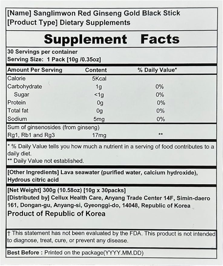 Korean Food Sanglimwon Gold Black Stick, High-Potency Red Ginseng with 17mg Ginsenosides, Luxurious Gift Package, 30 Sticks