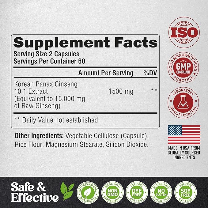- Made in USA With Globally Sourced Ingredients — Our Korean Ginseng supplement is proudly manufactured in the USA under strict quality control standards. Non-GMO, DYE-free, No Gluten & Soy-Free, and GMP-certified, Korean Panax Ginseng is produced with the most potent ingredients for maximum efficacy & purity in every batch.