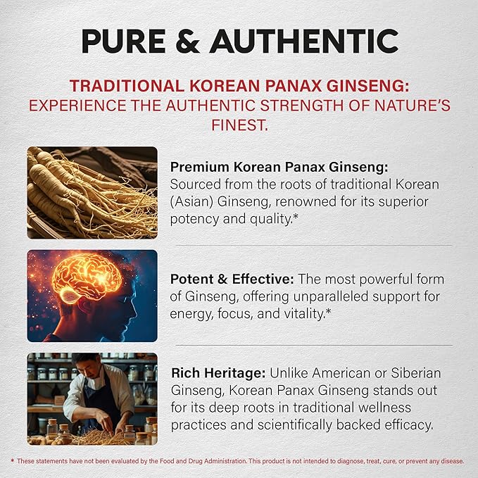 - Authentic & Traditional — Sourced from premium Korean Panax Ginseng, renowned for its unmatched potency and adaptogenic benefits. This traditional herb has been celebrated for centuries for supporting energy, focus, and vitality. Unlike American or Siberian ginseng, Korean ginseng offers superior quality & scientifically backed efficacy.