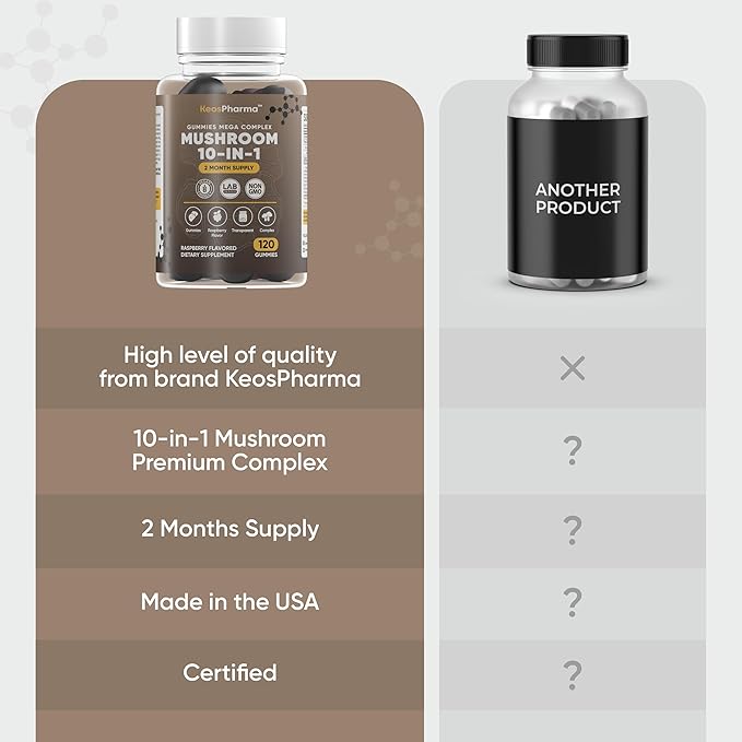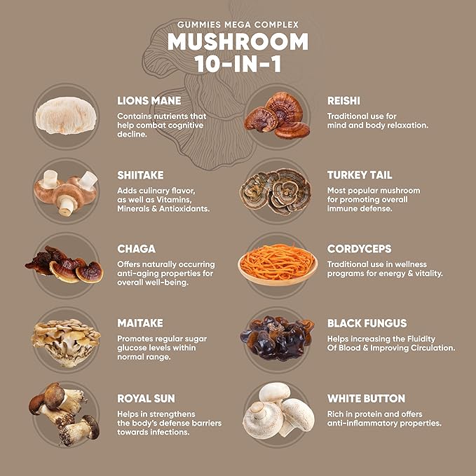 - 10-IN-1 MUSHROOM COMPLEX : Includes a mushroom gummies 10 blend - mushroom complex of 10 powerful mushrooms, such as reishi, cordyceps, and chaga, for comprehensive wellness support