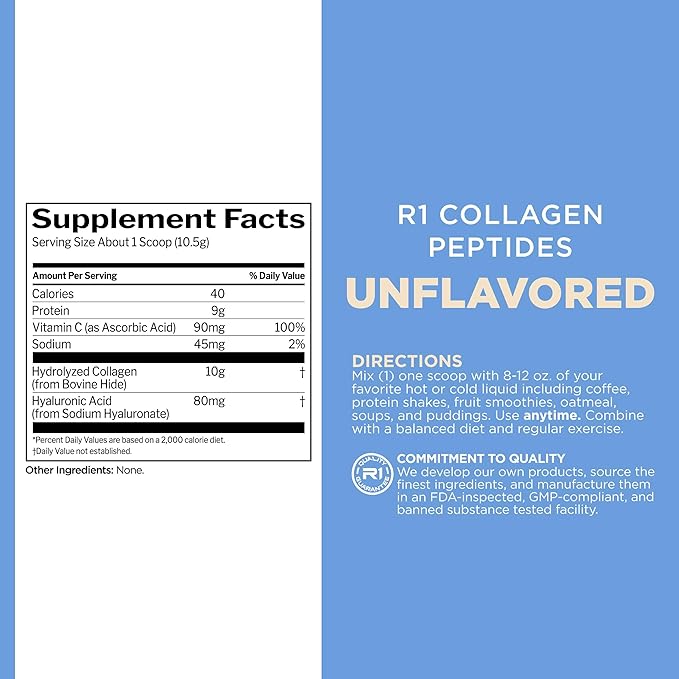 Rule 1 Collagen Peptides Powder - Hydrolyzed Bovine Collagen, Hyaluronic Acid, and Vitamin C. Supports Hair, Skin, & Nails (25 Servings, Unflavored)
