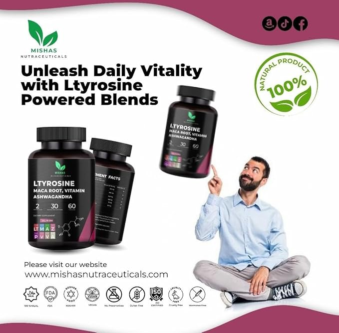 Nutraceuticals L-Tyrosine with Maca Root, Ashwagandha, Vitamins Complex, 60 Capsules, 30 Servings