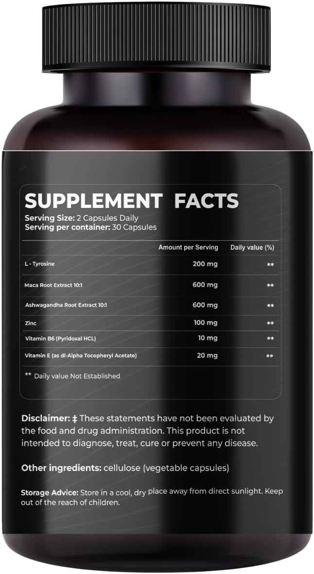- Primary Supplement Type : Maca Root, L-tyrosine, Ashwagandha