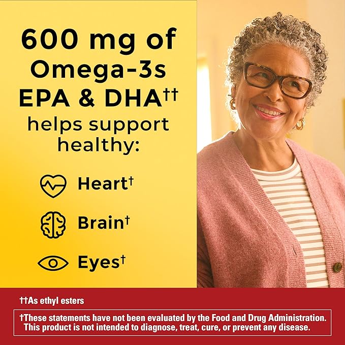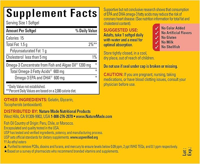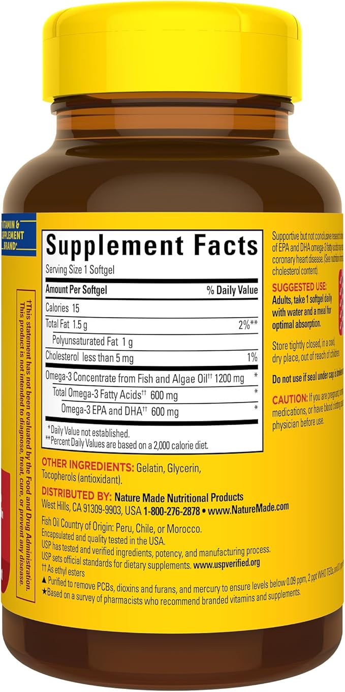 - Heart, eye and brain support supplement: contains one 60 count bottle of Nature Made Omega 3 (1) from Algae & Fish Oil 1200 mg (600 mg Omega-3) for a 60-day supply
