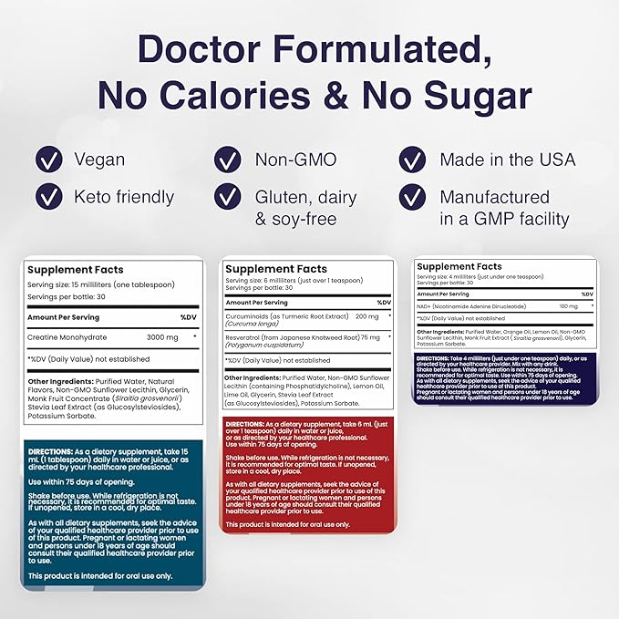 - ELITE PERFORMANCE BUNDLE: Fuel your fitness with the Elite Performance Stack. Featuring Liposomal NAD+, Curcumin + Resveratrol, and Creatine, this trio supports energy, recovery, and strength. Take all three daily—enjoy directly or mix with water, juice, or a smoothie for a convenient boost.