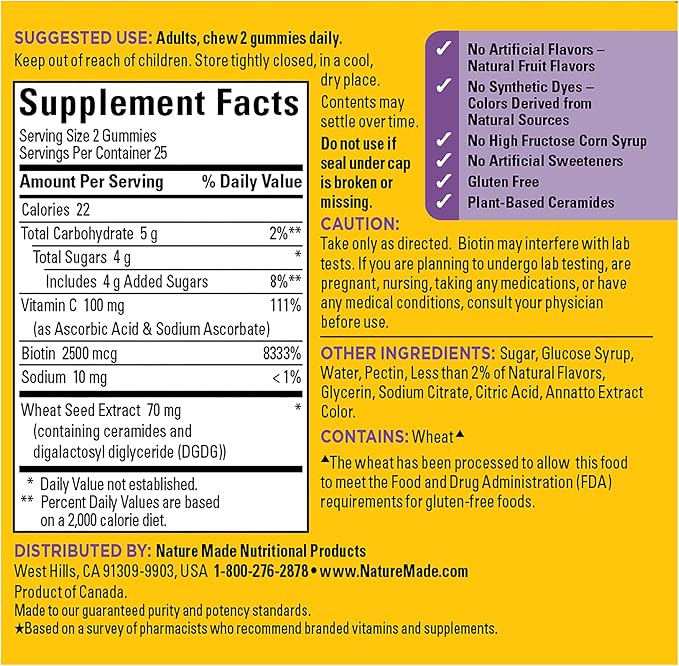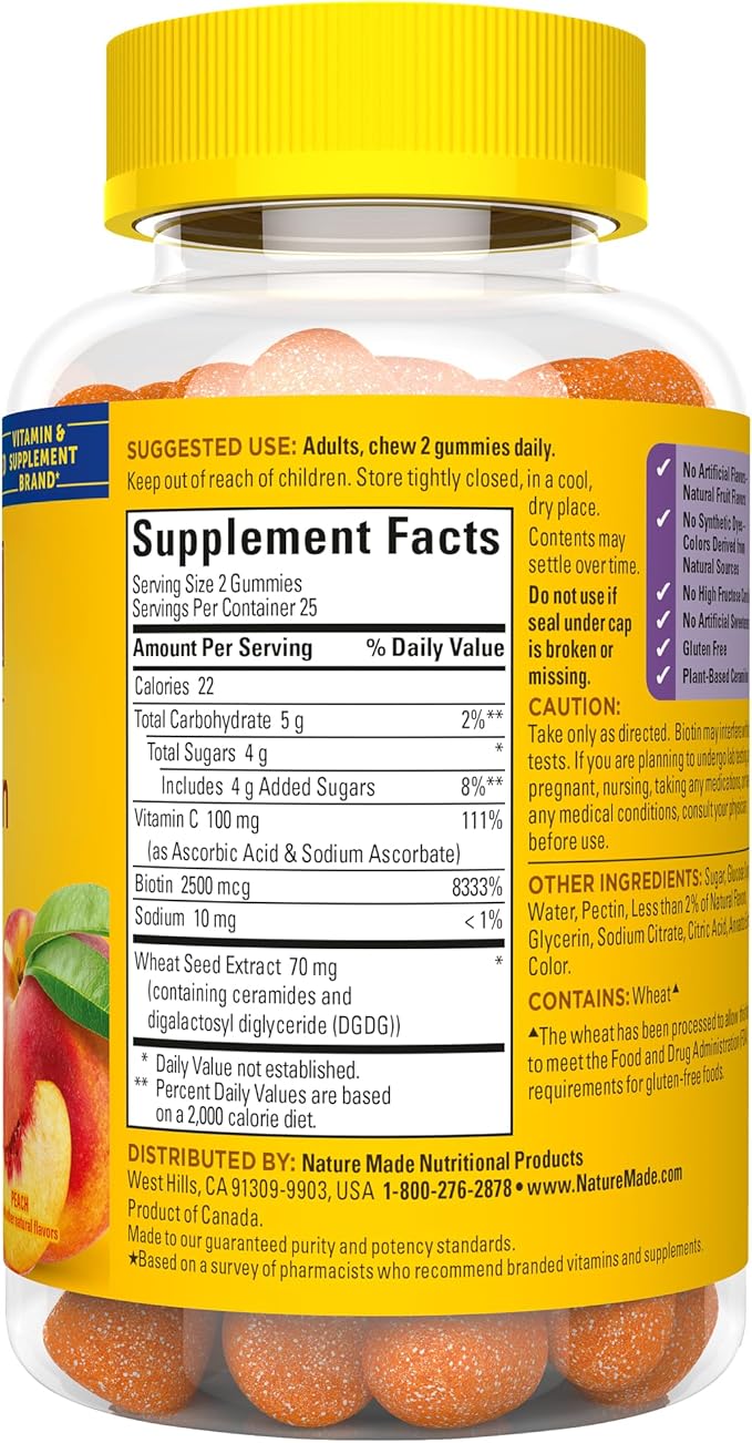 - Skin supplement: contains one 50 count bottle of Nature Made Skin Hydration + Ceramides Gummies for a 25-day supply
