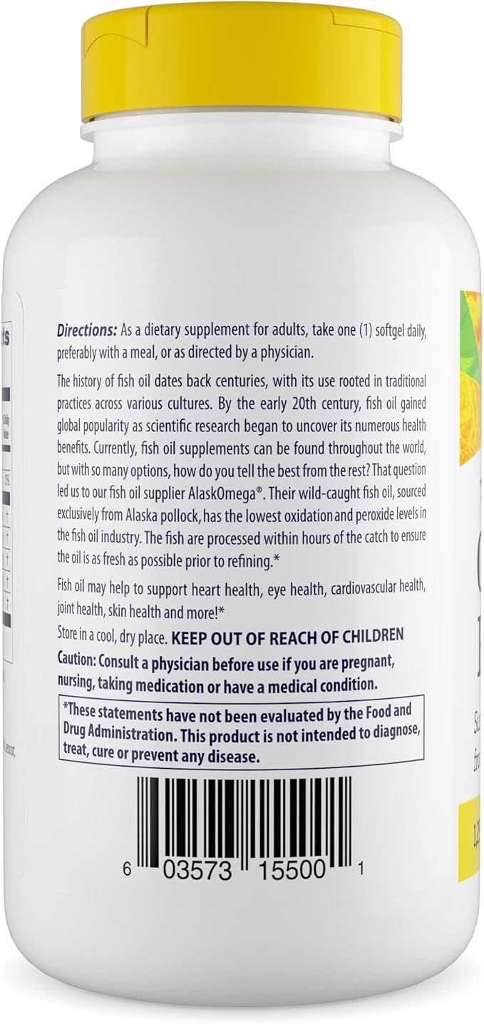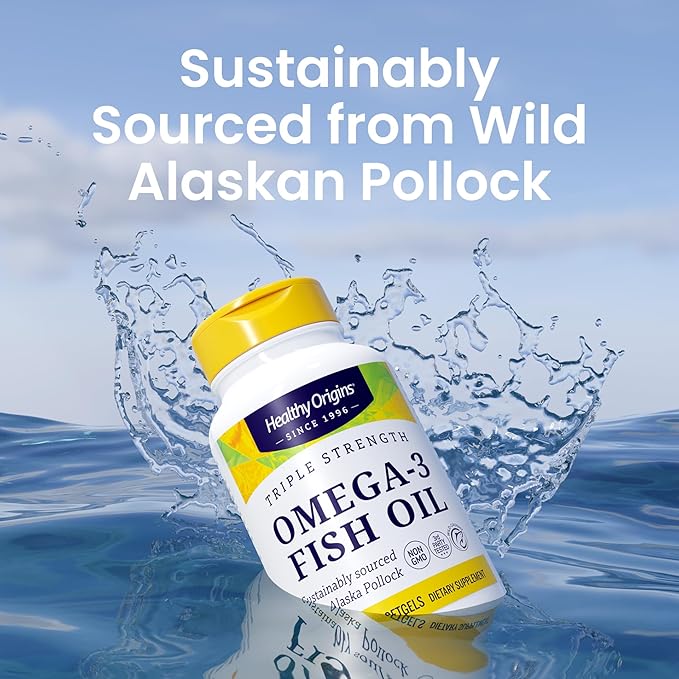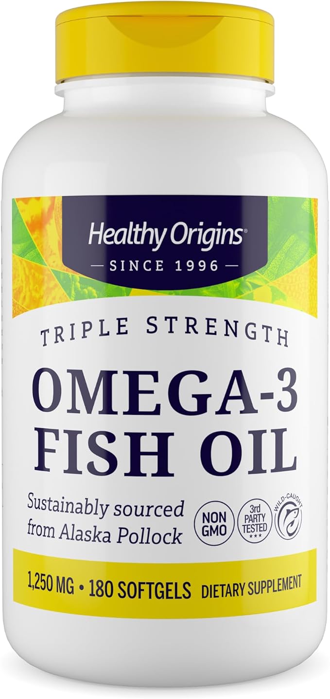 Healthy Origins Triple Strength Omega 3 Fish Oil 1250mg from Wild Alaska Pollock, with DHA, EPA & Omega 3s, Gluten-Free Non-GMO 180 Softgels