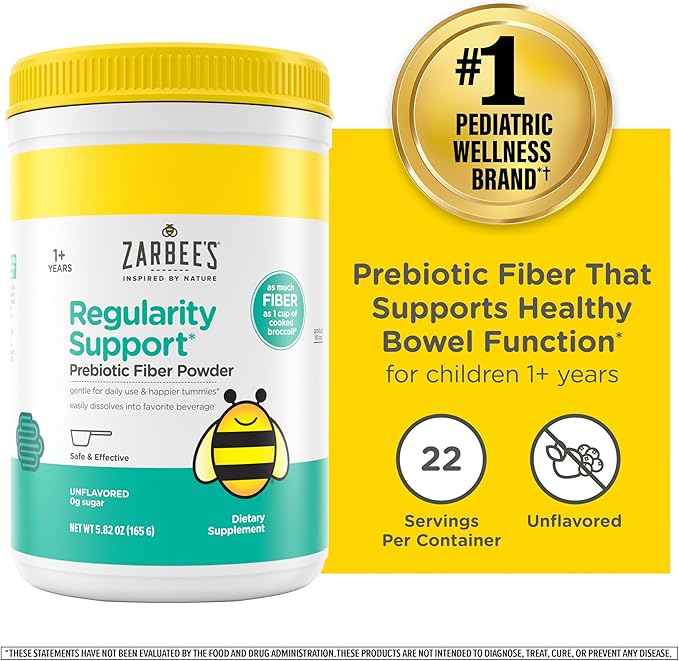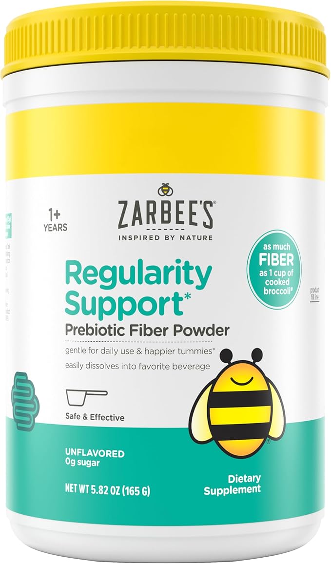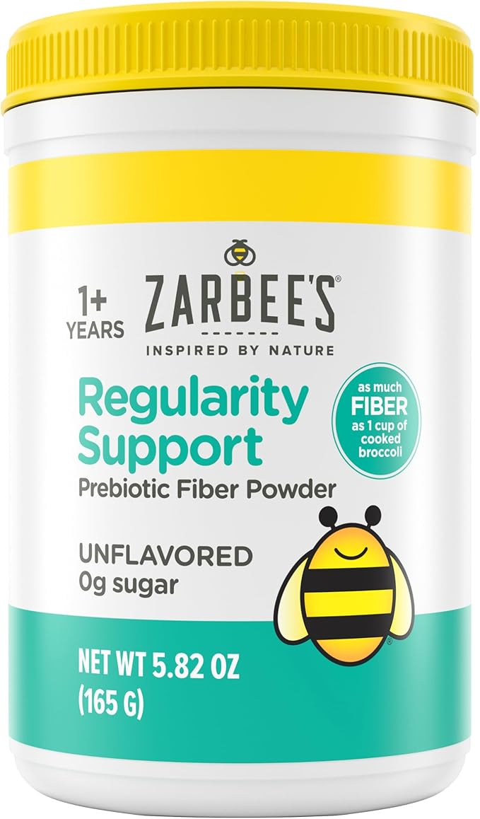 - Zarbee's Children's Regularity Support* Powder is an easy way to add fiber to your existing routine without adding sugar. For kids 1-12 years old, mix about one scoop of fiber powder with 6-8 oz of your child's favorite food or beverage