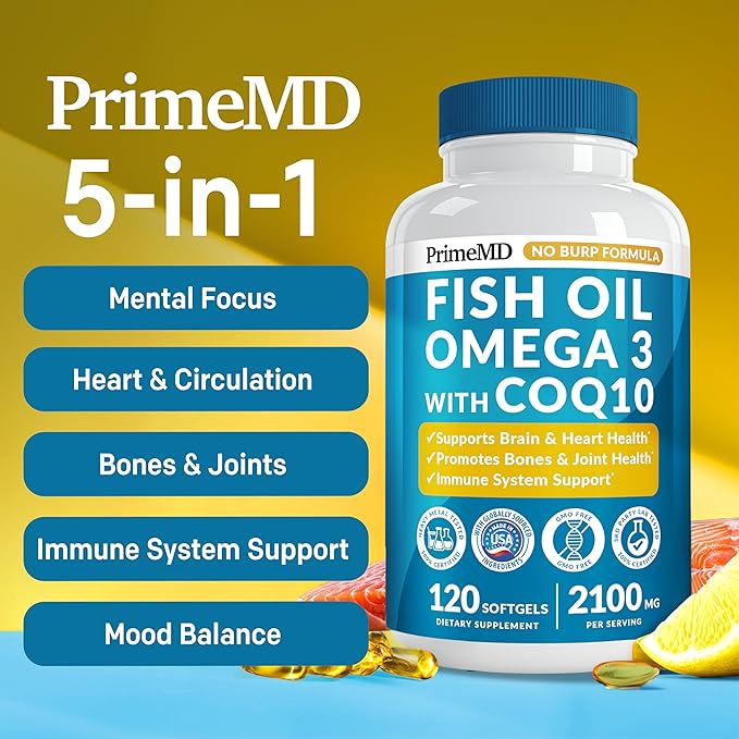 5-in-1 Fish Oil Omega 3 Fatty Supplements (2100mg) - Omega 3 Fish Oil with Vitamins D3 K2 and CoQ10 - Lemon Flavored (120 softgels, Pack of 3)
