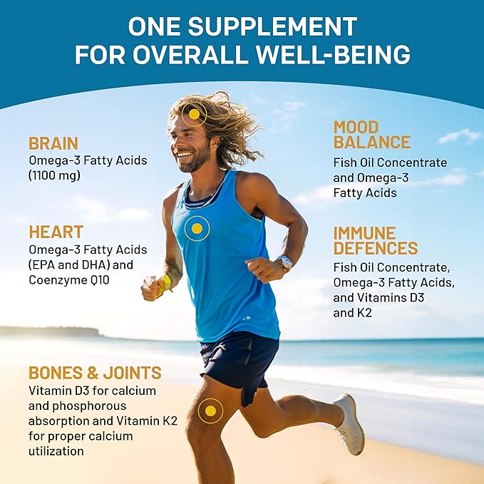 - Our Omega-3 Fish Oil blend is for those dedicated to elevating their health. It's rich in EPA and DHA, with the added benefits of CoQ10, and Vitamin D3 K2. It’s an all-in-one fish oil omega 3 supplements for comprehensive well-being.