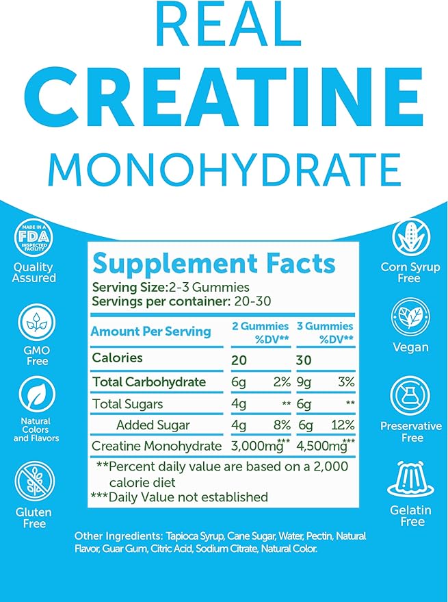 - Effective & Versatile Dosage – Take 2–3 gummies daily for a flexible dose of 3,000–4,500mg creatine monohydrate. Ideal for daily use with or without meals.