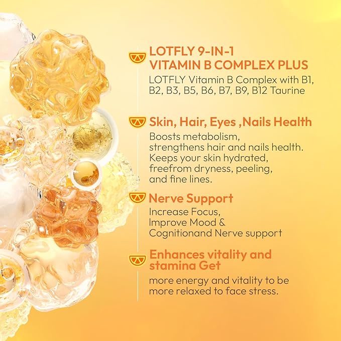 - Complete Support: LOTFLY Vitamin B Complex gives you the full range of 8 essential B vitamins—B1, B2 (Riboflavin), B3 (Niacinamide), B5, B6, B7 (Biotin), B9 (Folic Acid), B12—plus Taurine, all in one. This 9-in-1 powerhouse formula is made to boost your energy, support metabolism, and keep your nerves healthy, giving you everything you need in one go!