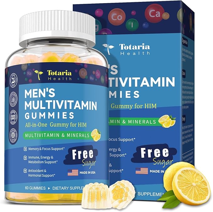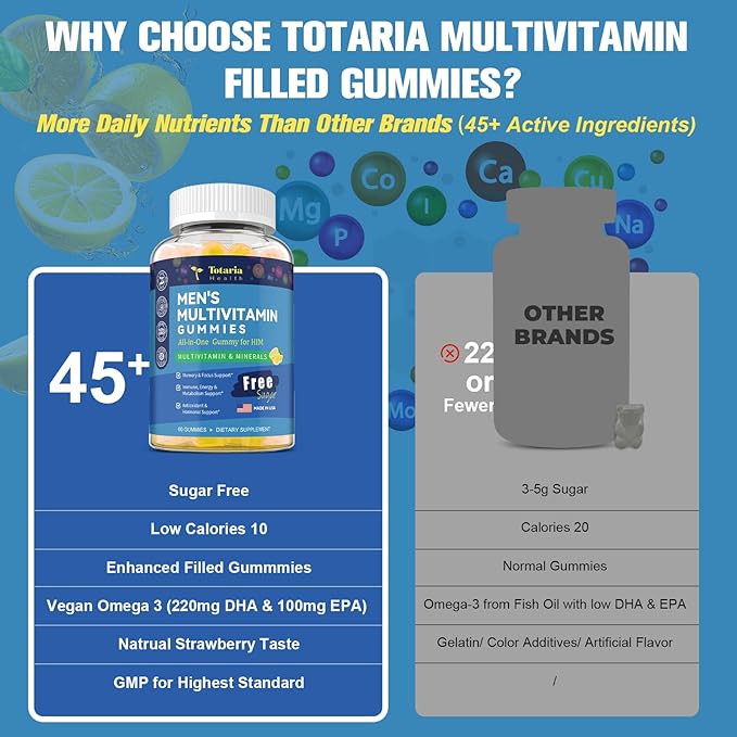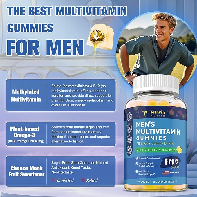 - Comprehensive Men's Multivitamin & Multiminerals: Specially formulated for men's daily wellness, this complete supplement provides 45+ essential vitamins, minerals, and plant extracts. It features highly bioavailable forms like Methylfolate (B9) and Methylcobalamin (B12) for enhanced absorption. With sustainably sourced Omega-3 DHA & EPA from marine algae, Totaria supports brain health, heart* function, immune defense*, and overall vitality — all in a convenient daily gummy.