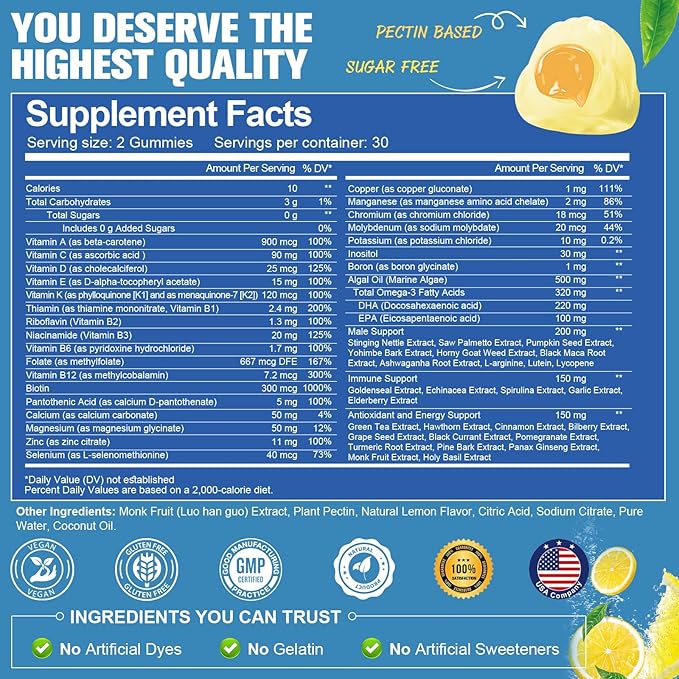 Sugar Free Men's Multivitamin Gummies w/Vegan Omega 3, Maca, Saw Palmetto, Vitamin A, B, C, E, D3, K, Zinc, Daily Methylated Multivitamins for Men, for Immunity, Energy, Lemon Flavor, 60 Counts