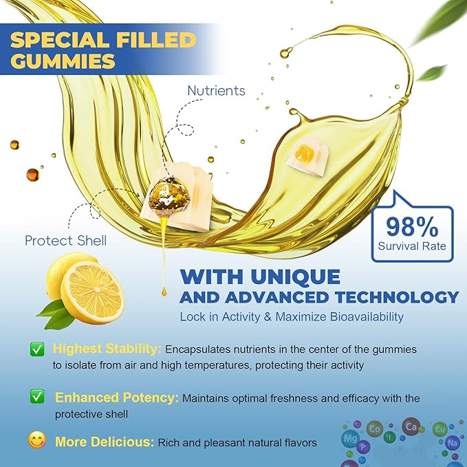 - Premium Guarantee: The delicious natural lemon flavor easily provides the beneficial nutrients you need in your busy life. Chew two gummies a day. Gluten-free and vegetarian, No dairy, wheat, peanut, or egg. 100% VEGAN. If you have any questions, please contact us, your satisfaction is our TOP priority.