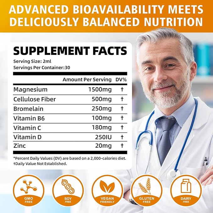 - 7-in-1 Synergistic Formula: Magnesium glycinate liquid can promote optimal magnesium levels, important for improving zzZZ quality. Cellulose fiber, bromelain promote healthy digestion, Vitamin D is included in this formula to help support optimal bone health, Vitamins B6 C & Zinc may support immune system.