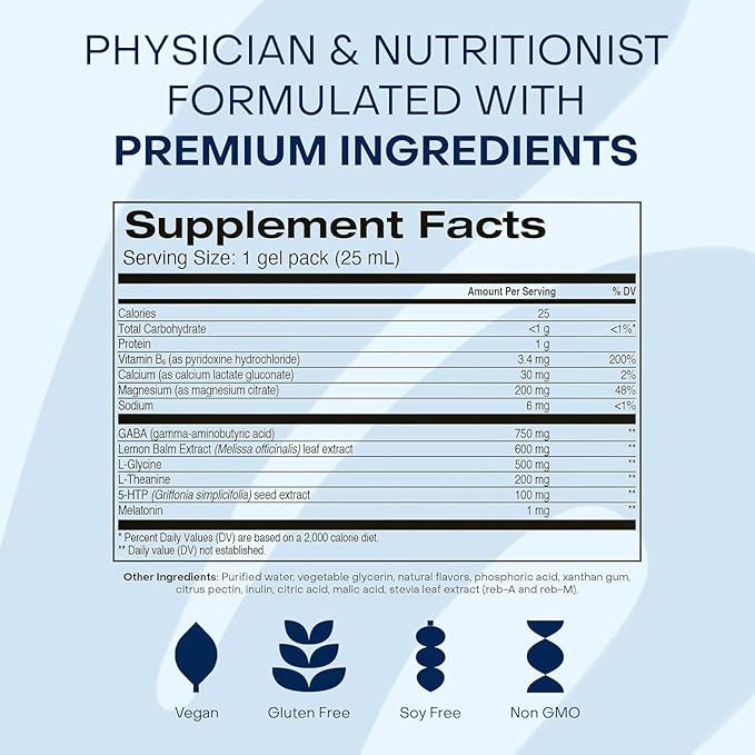 - Replaces 7 Pills: Over 2,384 mg of potent sleep nutrients in one gel pack, including melatonin, L-theanine, magnesium, 5-HTP and GABA. To get the same effective doses of these nutrients, you would need to swallow over 7 large capsules