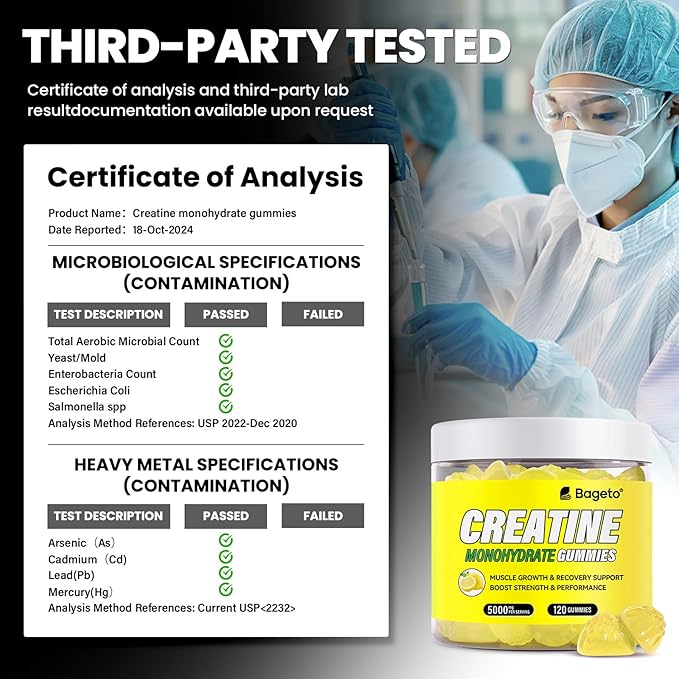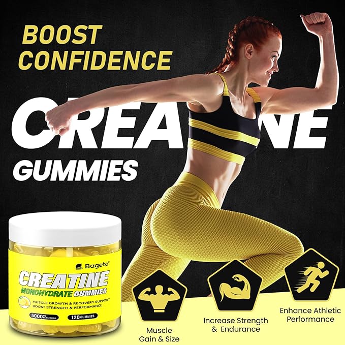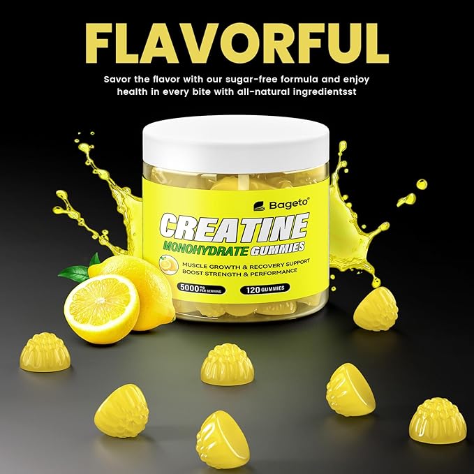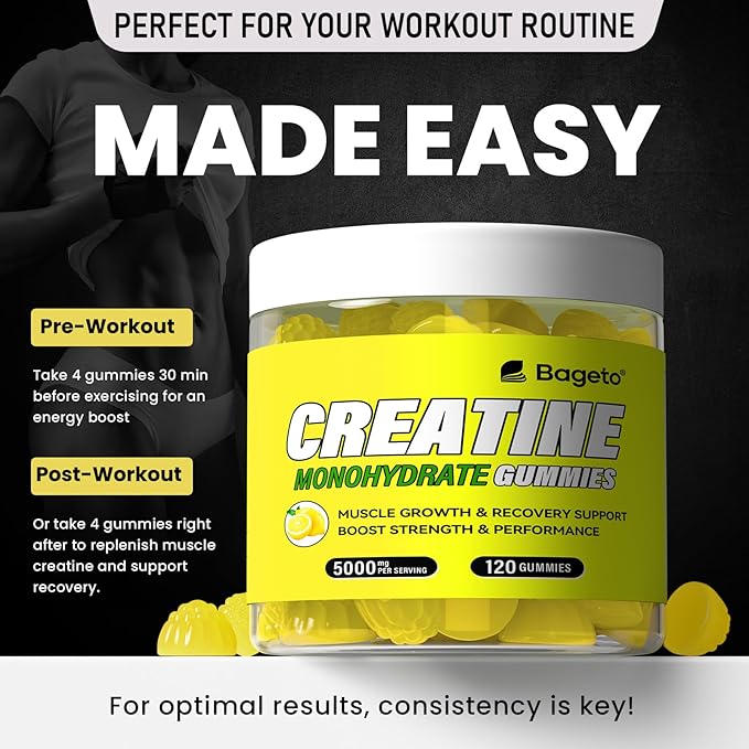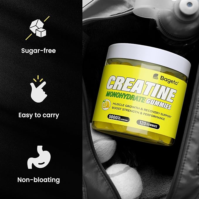 - Key Benefits: Our Creatine monohydrate gummies are an easy way to consume. You can take 4 gummies per serving at any time and any place. Bageto creatine monohydrate gummies help promote lean muscle growth, elevate athletic performance, improve high-intensity exercise capacity, enhance muscle strength, and aid in muscle recovery