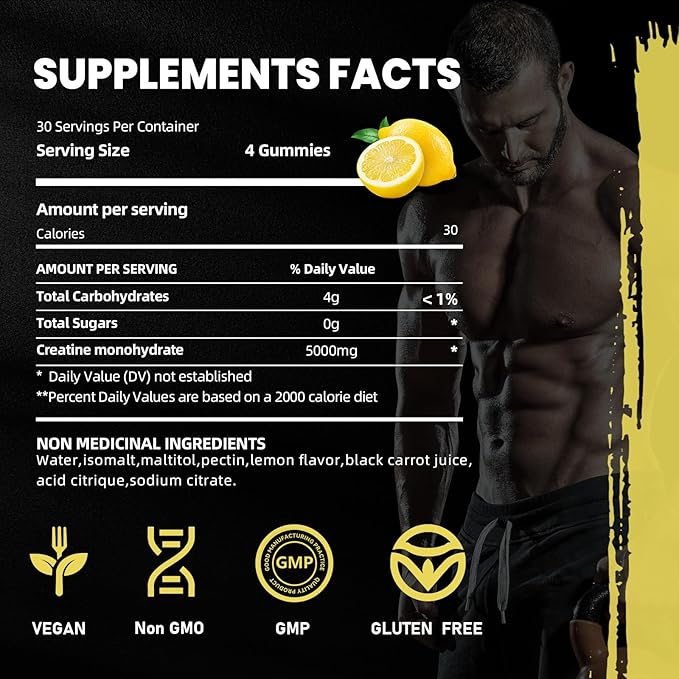 - Vegan, No-Gelatin, 0g Sugar: Each bottle contains 120 count of vegan, non-GMO, and No-gluten creatine monohydrate gummies that are also 0g Sugar. Say goodbye to bulky creatine powders and the hassle of measuring scoops. Our gummies are far from chalky textures or messy scoops. Bursting with lemon flavors, they turn your daily creatine intake into a delightful treat
