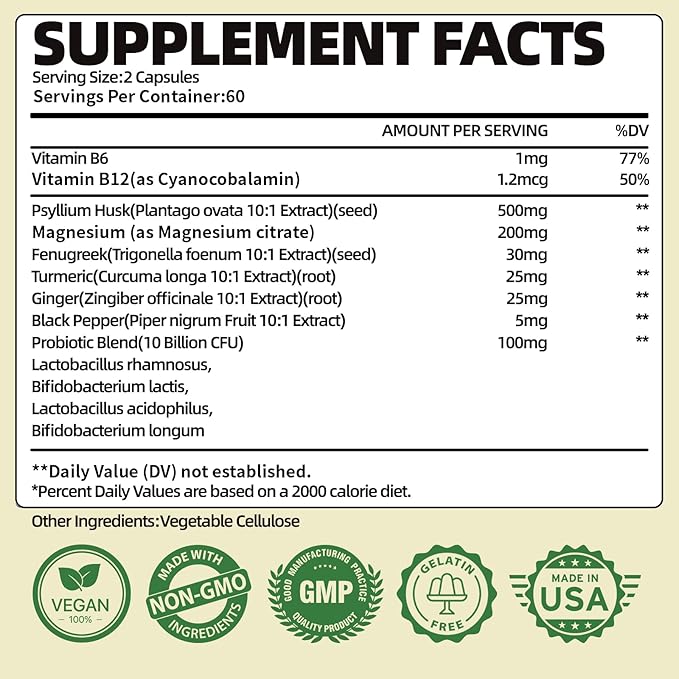 - [All-In-One Formula For Comprehensive Gut Health] These psyllium fiber capsules are specially fortified with magnesium and probiotics in addition to the core ingredient psyllium husk. Magnesium helps relieve muscle tension, while probiotics enhance the health of your gut microbiome. In addition, the product contains other beneficial ingredients, such as B vitamins, which help maintain energy levels in the body; and botanical extracts to promote overall digestive health. These ingredients work synergistically to provide users with comprehensive digestive support and superior overall health maintenance.