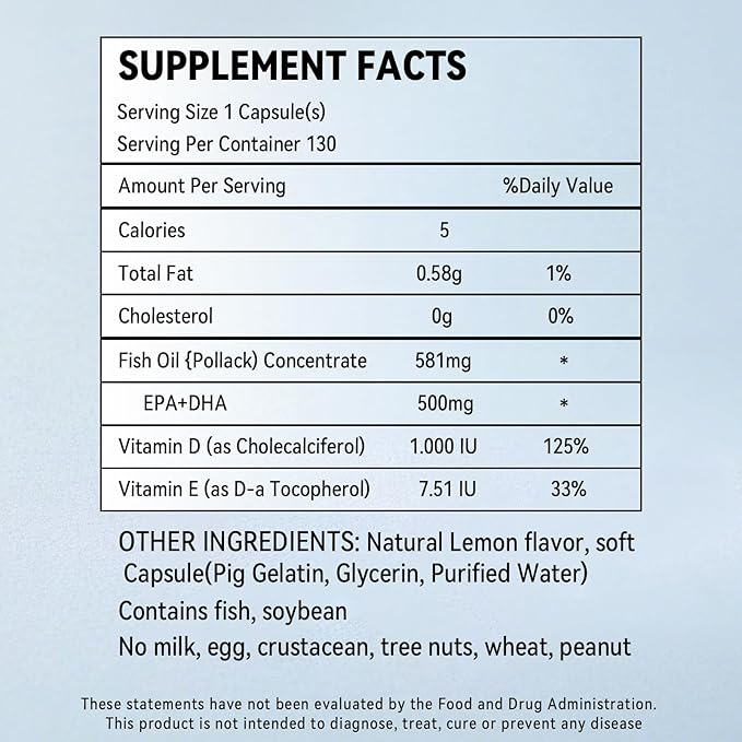 - Lemon Flavored Burpless Fish Oil: EPA DHA omega 3 supplement sourced from wild-caught pollock, purified to remove heavy metals, PCBs, and toxins, tastes better without the fishy smell