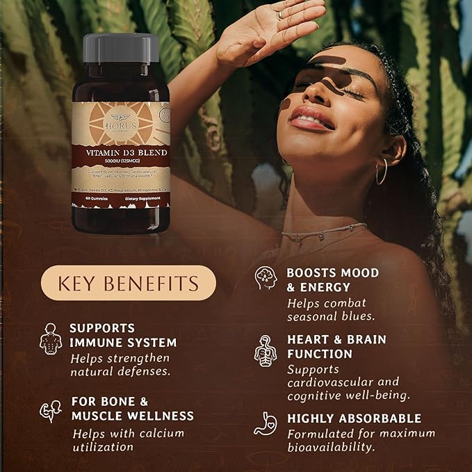 - Daily Nutrient Synergy for Overall Wellbeing: Embrace the full spectrum of benefits from our expertly crafted Horus Vitamin D3 5000 IU; this powerhouse assembly of nutrients works in unison to ensure your body's peak performance. From enhanced bone density to muscle strength and immune resilience, our blend delivers comprehensive support, allowing you to thrive and embrace life's adventures with confidence.