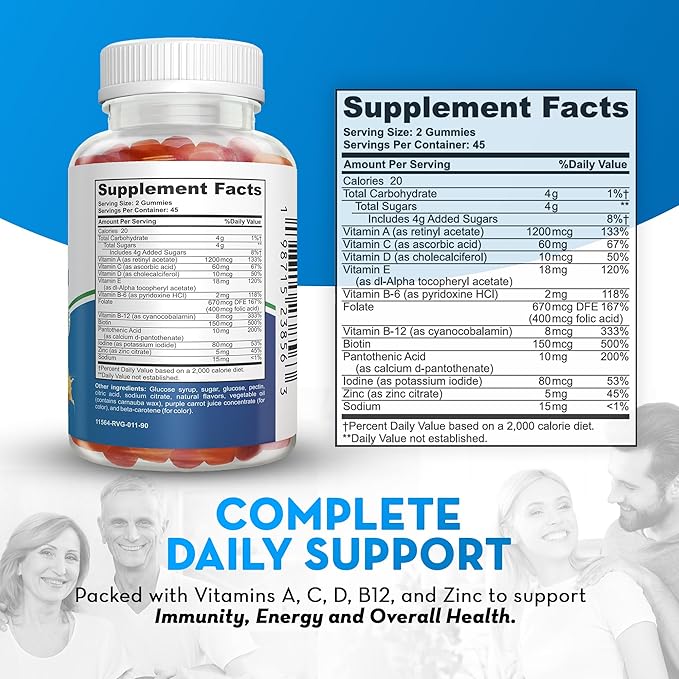 - Complete Daily Support – Contains essential Vitamins A, C, D, B12, and Zinc to help maintain immune health, energy levels, and overall well-being.