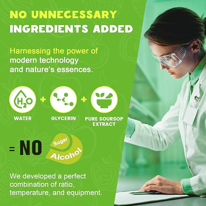 - No Superfluous Additives: To ensure the purity and effectiveness of the product, our soursop drops are made from pure soursop organic extract without any other added ingredients, only organic glycerin and water, no other unnecessary additives. Soursop is the perfect natural supplement to better serve your body without adding any additional ingredients.
