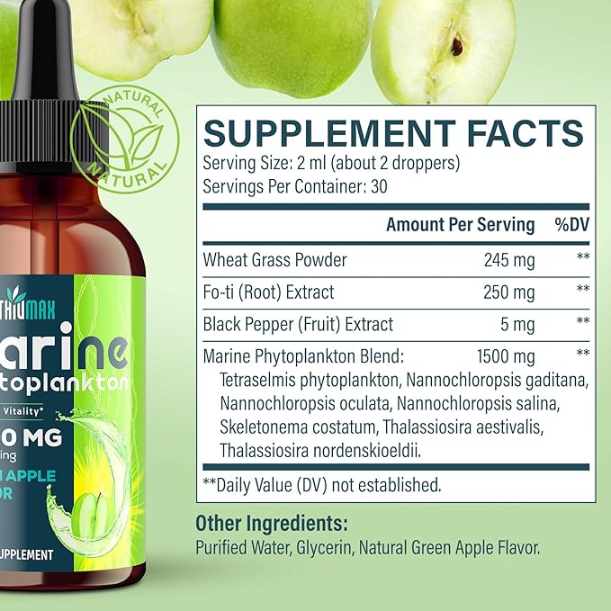 Marine Phytoplankton Drops 2000mg - High Absorption Phytoplankton Supplement with Wheatgrass & Fo-ti for Cellular Wellness, Hair Growth, Energy & Immunity | Green Apple Flavor, 60ml (Pack of 1)