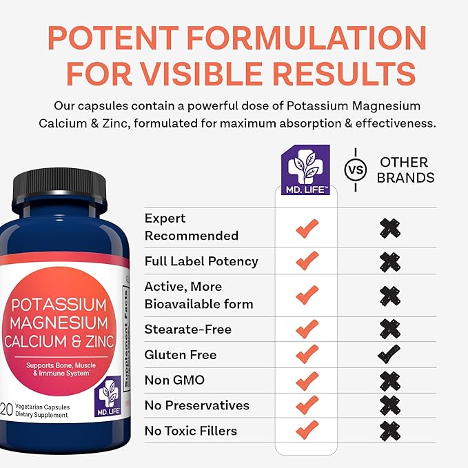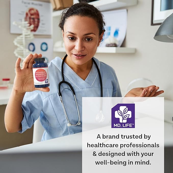 MD. Life Potassium Magnesium Zinc Calcium Supplement – Supports Bone Health & Muscle Health – Promotes Calcium Absorption and Immune Function – Magnesium Potassium Zinc Aspartate - 120 Capsules