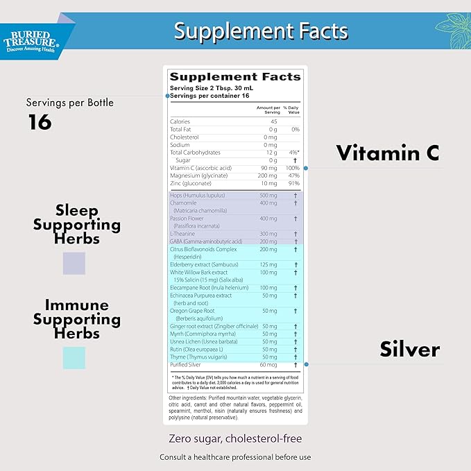 - Herbal Extracts & Nighttime Wellness: Achieve nighttime wellness with Buried Treasure ACF PM's herbal extracts like thyme and chamomile, which promote relaxation support and immune function. This liquid supplement offers a soothing sleep formula for a comfortable breathing experience