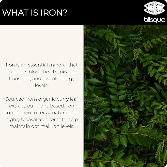 Blisque - Organic Plant-Based Iron Formula for Blood Health, Immune Support, and Energy | from Organic Curry Leaf Extract | 90 Capsules