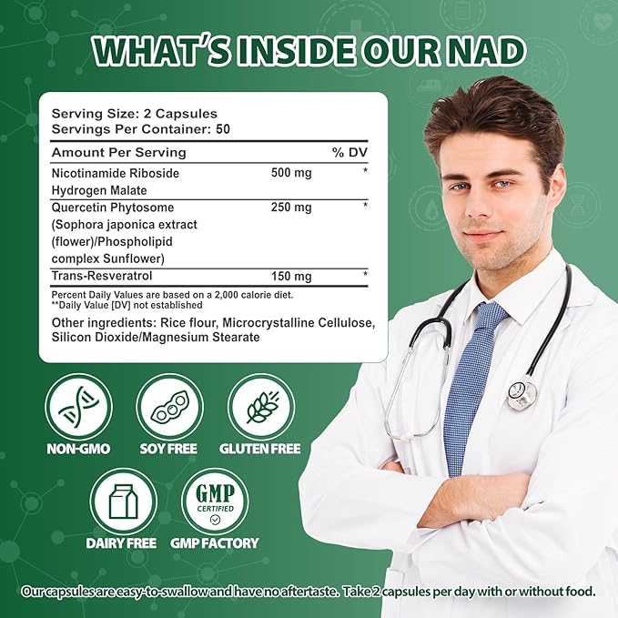 - Premium NAD+ Formula: Our NAD+ Resveratrol supplement contains Nicotinamide Riboside, Quercetin PhytoCapsule, and Resveratrol. Take two NAD capsules daily for maximum health benefits.