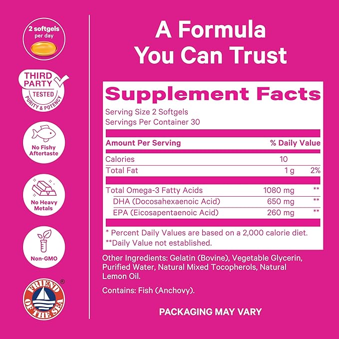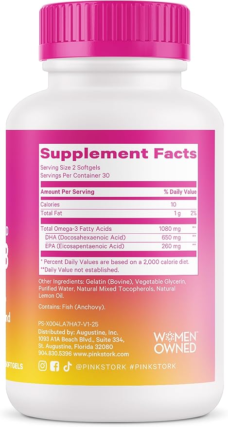- DHA + EPA: Pink Stork Omega 3 Fish Oil features two vital omega 3 fatty acid supplements - 650 mg DHA and 260 mg EPA from sustainably sourced fish. Add to your wellness ritual to support brain, eye, and mood health; take 2 softgels daily for optimum wellness.