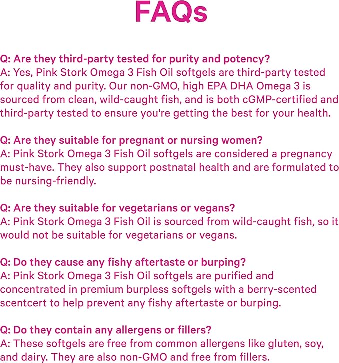 - CLEAN + TRUSTED: Our non-GMO, high EPA DHA Omega 3 supplement is sourced purely from clean, wild caught fish from Friend of the Sea certified sustainable fisheries. Each Pink Stork product is cGMP-certified and third-party tested for quality - ensuring you get only the best for your health!