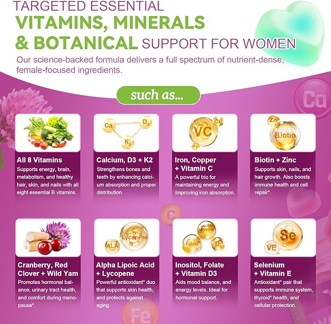 - Comprehensive Women’s Multivitamin Gummies: Totaria delivers 36 essential nutrients per serving, including 100% or more of your daily needs for Vitamins A, C, D3, E, and K to support vision, skin, bone, and immune health. A powerful combination of vitamins, minerals, herbal extracts, and targeted women’s health nutrients. Designed to meet the daily nutritional needs of women ages 14+, whether you're 40 or 50 over, these sugar-free gummies help close common nutrient gaps with a convenient and delicious format.