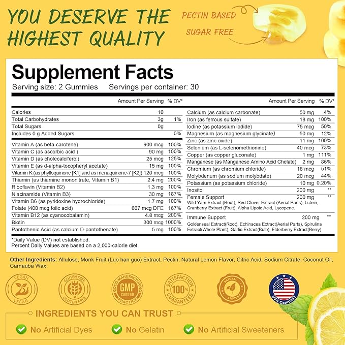 Sugar Free Multivitamin Gummies for Women 14+ w/Iron, Bariatric Multivitamin, Inositol, Folate, Biotin, Womens Daily Gummy w/Vitamin A, D, C, B, for Hair, Skin, Energy, Immune, Lemon Flavor