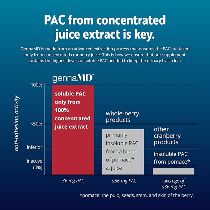 - CLINICALLY PROVEN 36 MG SOLUBLE PAC FROM 100% CRANBERRY JUICE EXTRACT. Urologist-recommended GennaMD by Solv Wellness contains 36 mg soluble PAC from 100% pure cranberry juice extract—the only PAC clinically proven to help keep your urinary tract clear of UTI-causing bacteria.