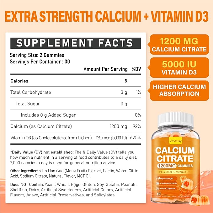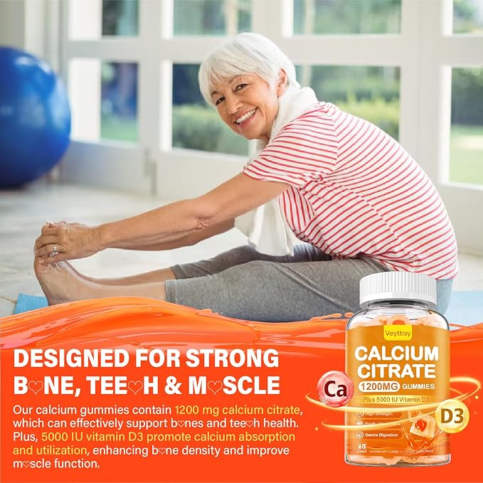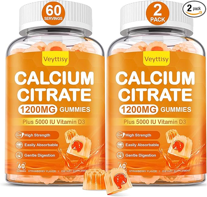 - FORMULATED FOR YOUR BODY STRENGTH: Each calcium gummy delivers 1200 mg of high-absorbing calcium citrate, essential for enhancing b0ne density and health while supporting teet h health and m uscle function. Moreover, enhanced with 5000 IU vitamin d3,our calcium citrate 1200 mg gummies help improve immune system function,regulate immune response and enhance immunity, providing comprehensive daily support for robust health. Just 2 gummies a day help you can maintain vitality for the whole day.
